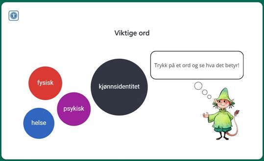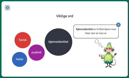 Info: Dette oppslaget i lærerveiledningen viser til bildet ovenfor med overskrift «Han, hun eller hen?» (digitalt), «Jeg er litt forvirret» (bok-form), og den viser til bildet av pepperkake-mannen med overskrift «Hva er kjønnsidentitet?»